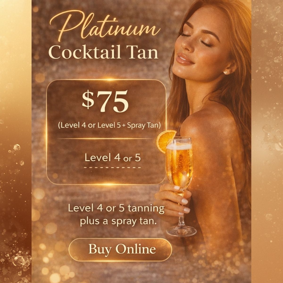 Includes your choice of tanning in Levels 4 or 5, plus your choice of VersaSpa Spray tan in any color. $75 Platinum Cccktail Tan