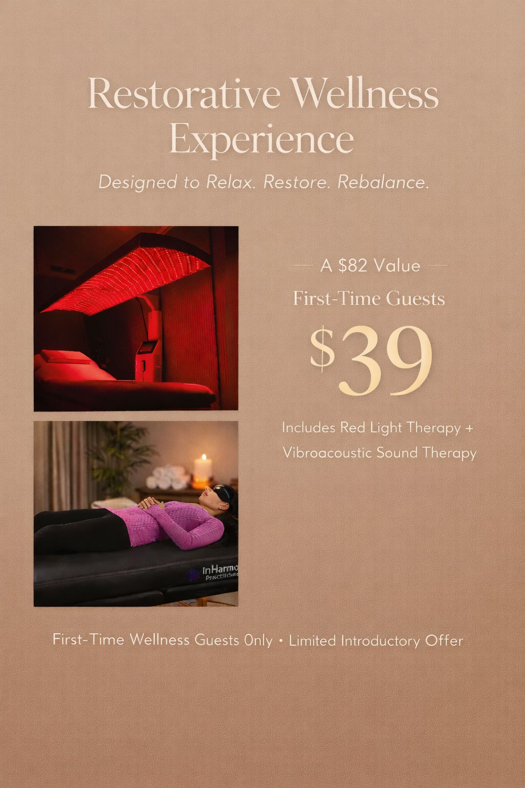 1 Session Full Body LED Red Light Therapy, Level 5, plus 1 Vibroacoustic Sound Therapy session. Limit 1 per person- Can not be comined with any other offer.